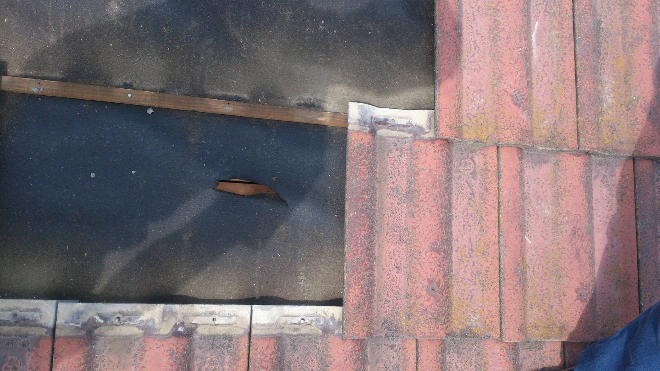 今回の現場では雨のシミができていた部分の上がわの瓦をはずさせてもらったらルーフィングがやぶれていました。