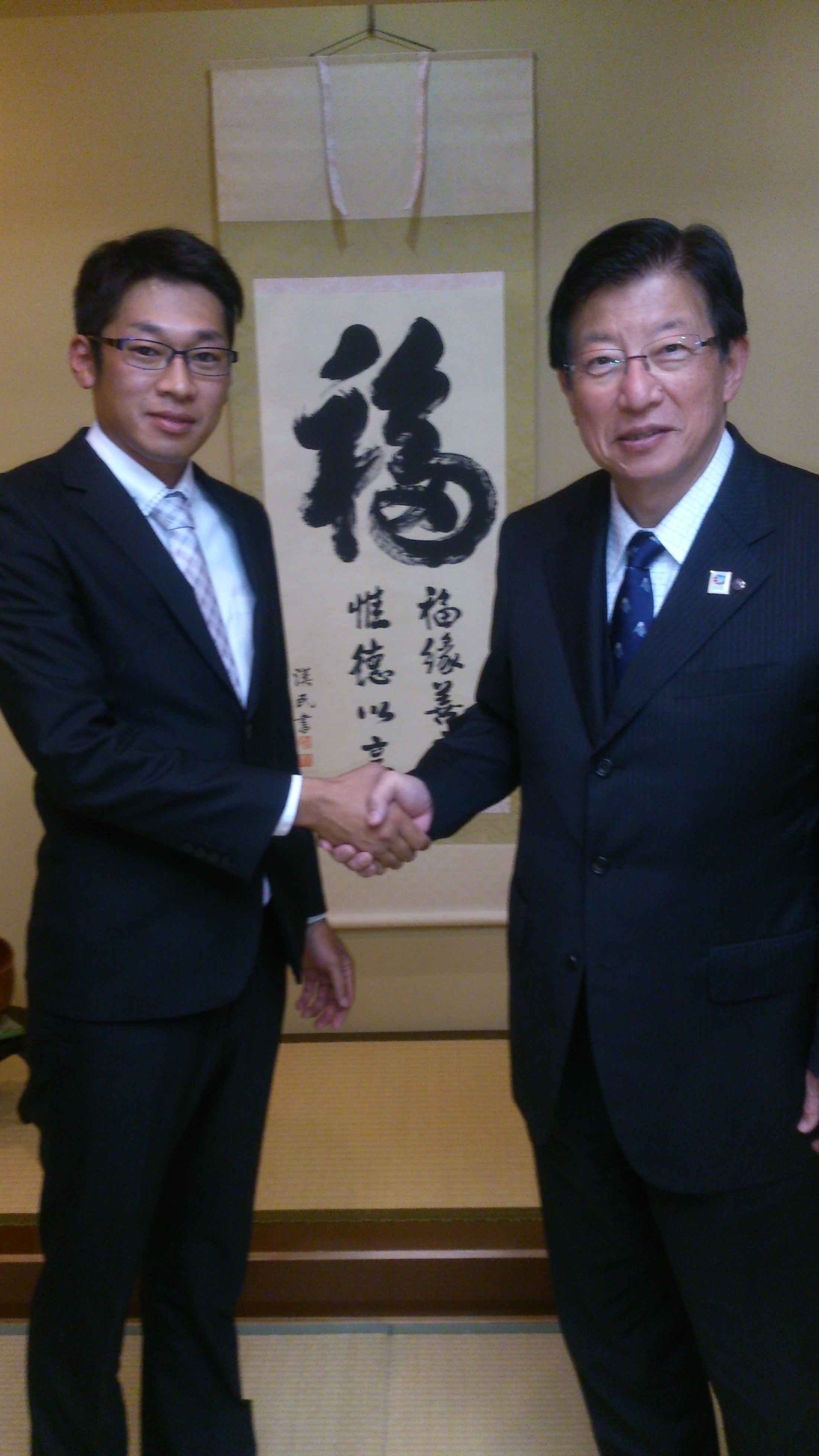 商工会のお誘いで短い時間ですが県知事と会食をさせていただきました。 知事を合わせて8人という小さな席で話をしたり聞くことができ人生の中でも貴重な時間のひとつになりました。 静岡という県、それぞれの地方の特色など県全体のよさを改めて教えてもらい、勉強になりました。 特に地方の声を大事にしているようでした。そのために昨日は伊豆に今日は浜北にと知事室にあまりいないそうです! それと、これからはどのようなことをしていくか、そうすることによって静岡や地方はどうなるかのビジョンなども聞けて大変勉強になりました。 ちなみに浜北区に来るときは遠鉄鉄道(赤電車)に県議会議員とのってきたそうです!いきなり目の前に現れたらびっくりしちゃいますね!!