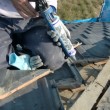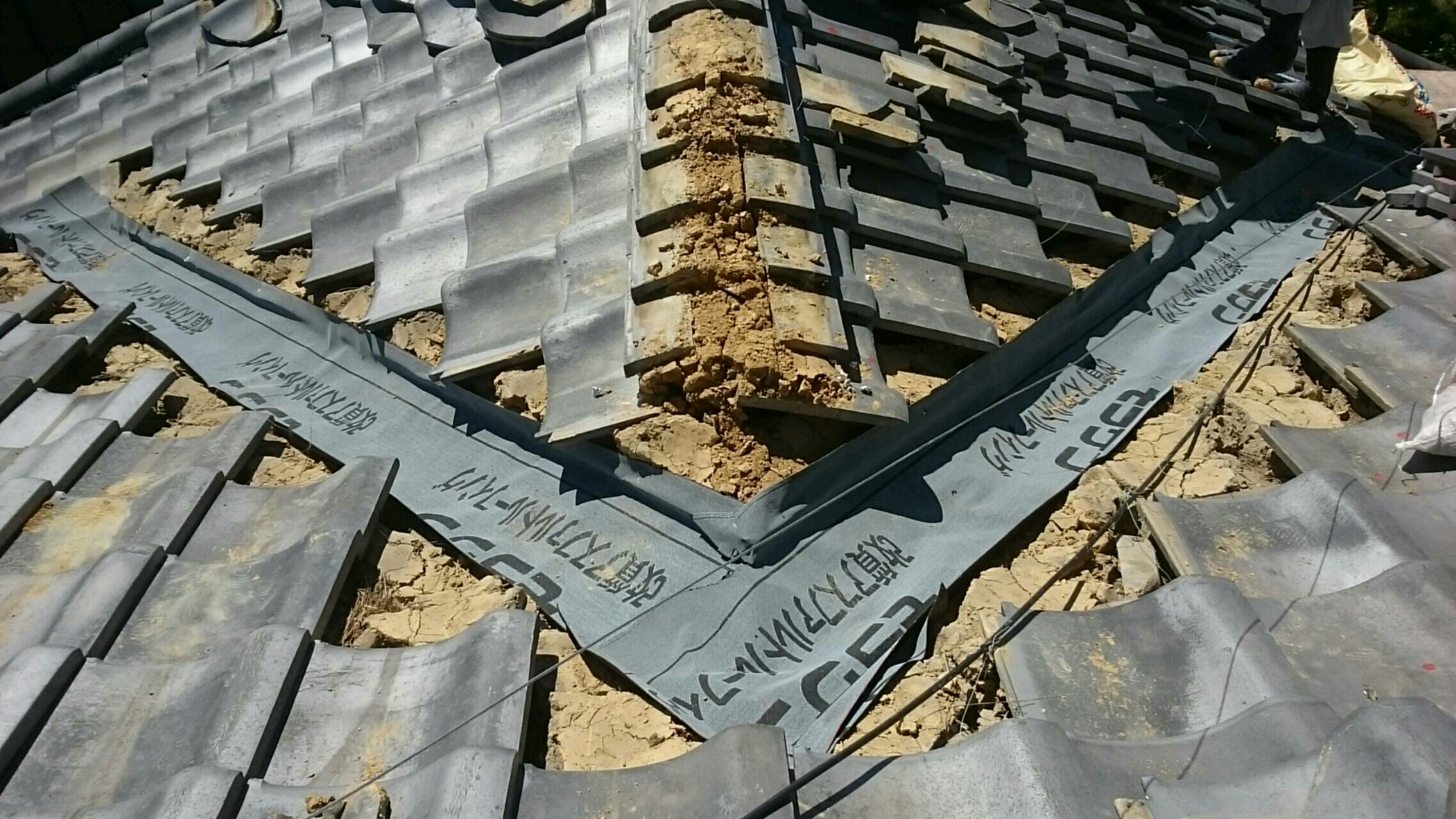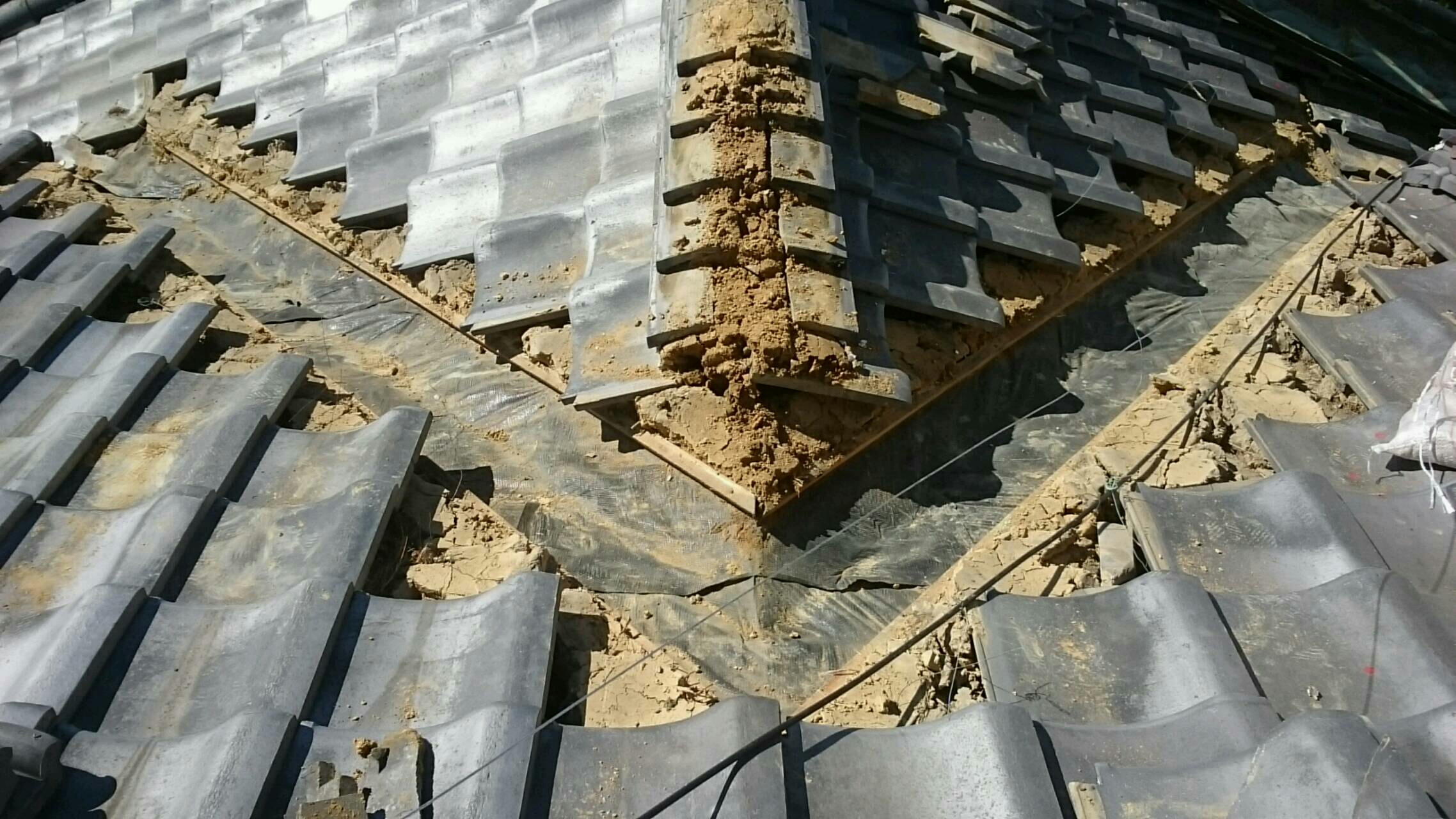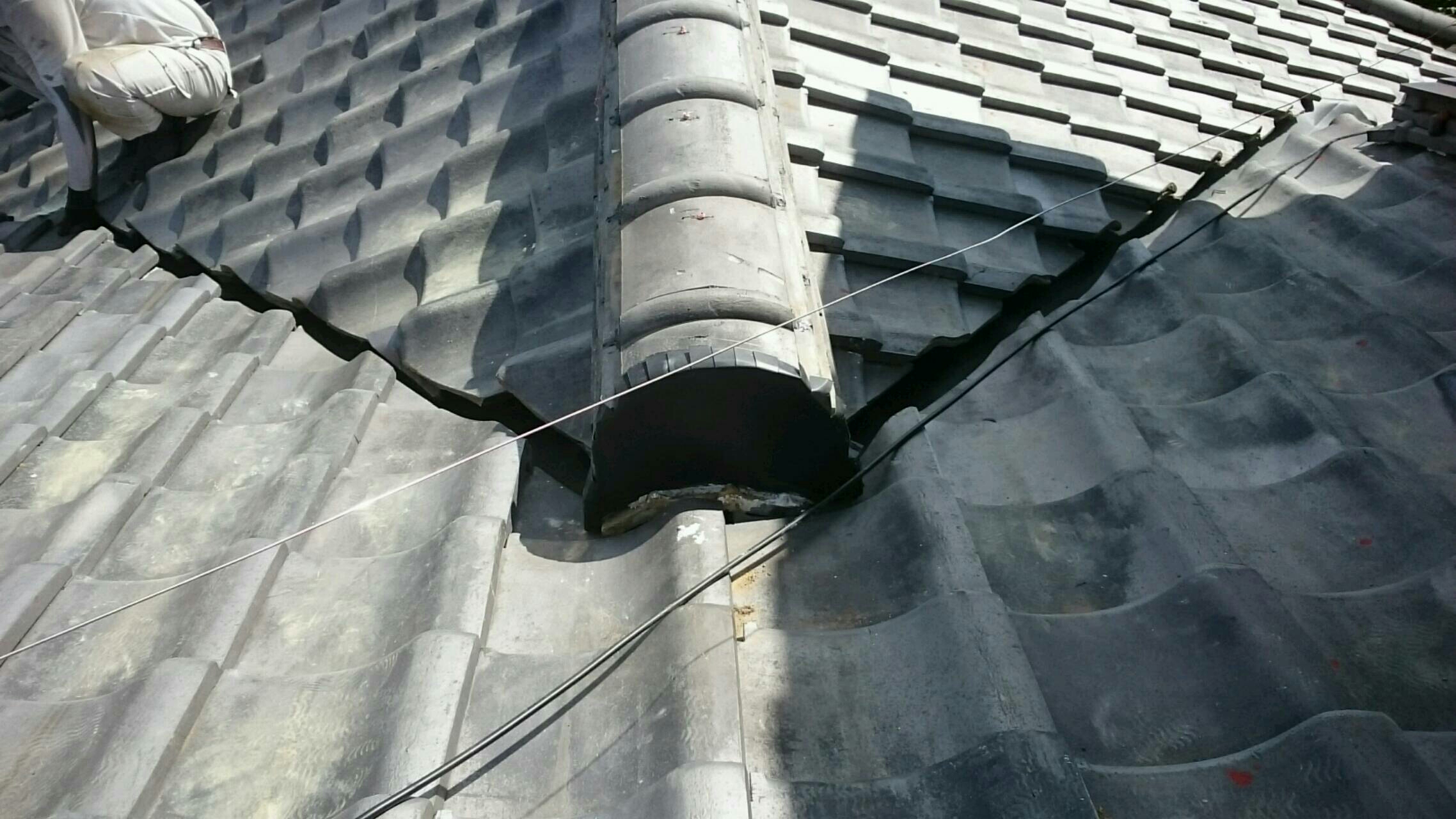 ⑤棟瓦・平瓦を戻し、棟瓦の最後の部分に蓋をしてます。