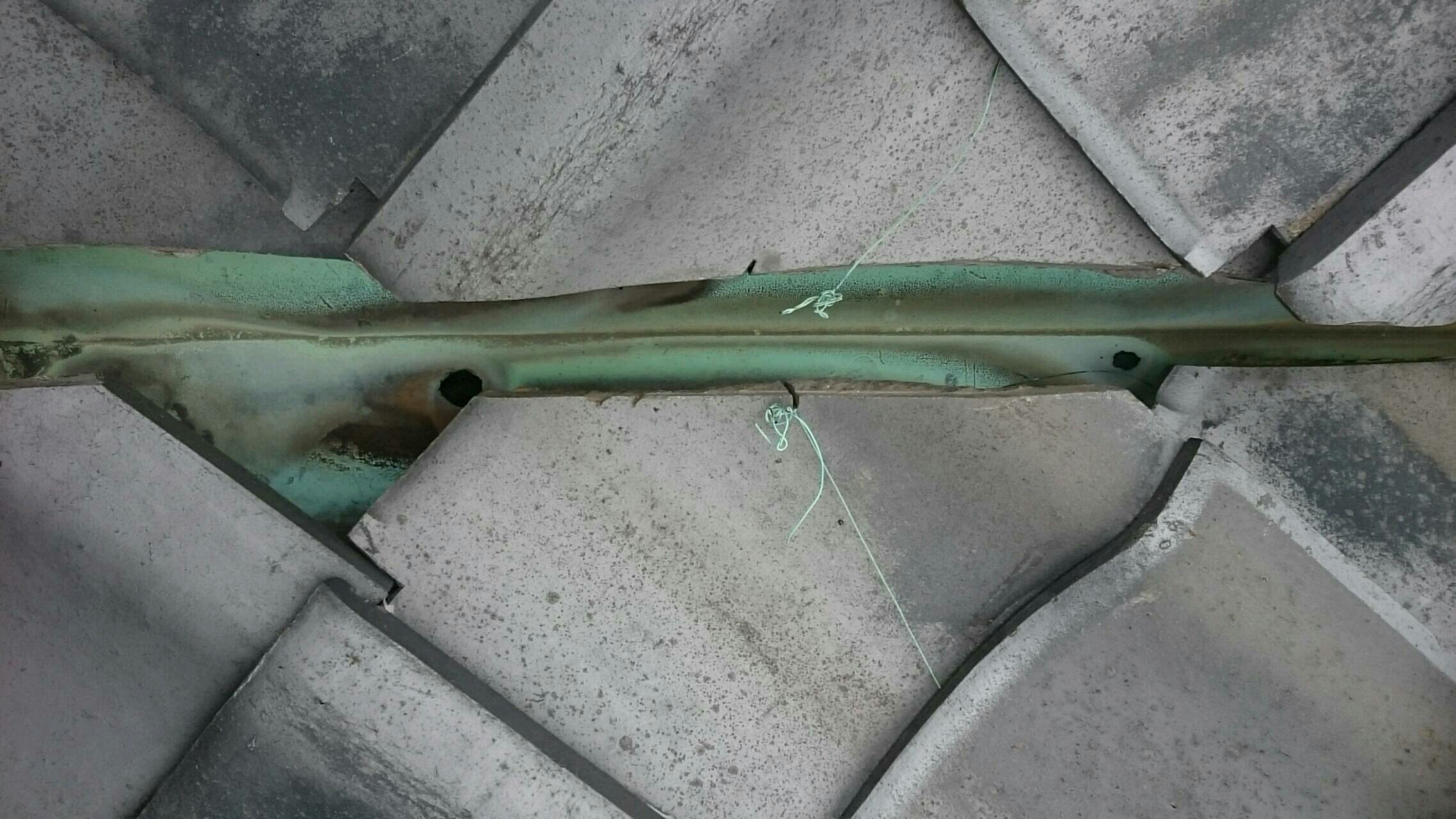 雨漏りの原因になっている銅板の谷板金の劣化にによる穴です。他にも劣化により穴があく可能性がありそうなのでステンレスの谷板金に交換します。一、二ヵ所と穴があいて家の中まで雨漏りしてる場合は穴があいた場所いがいも谷板金が劣化している可能性があります。