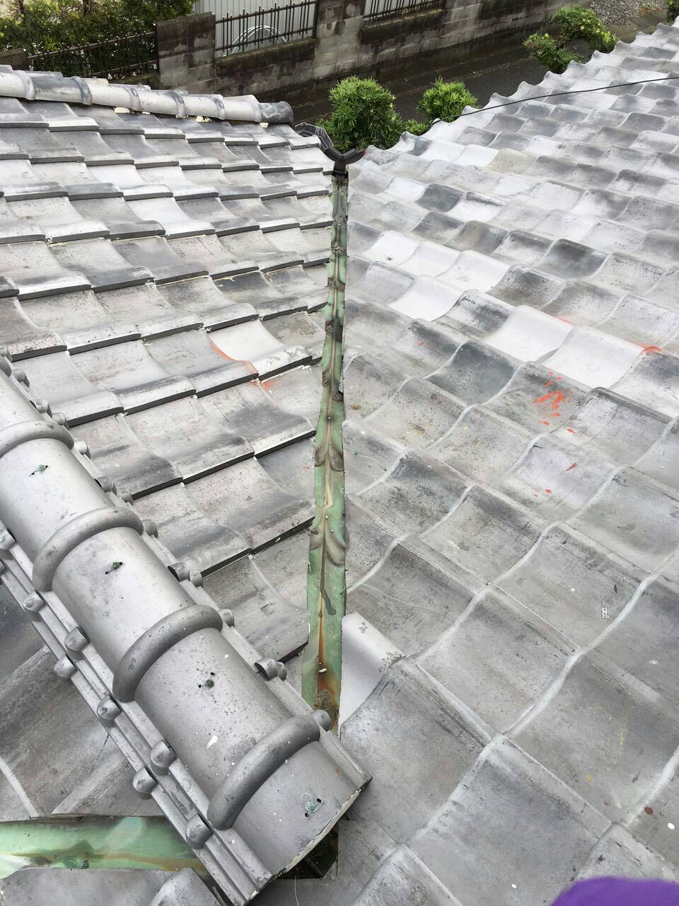 施工前の写真になります。銅製の谷樋が劣化しところどころ穴が空いていました。