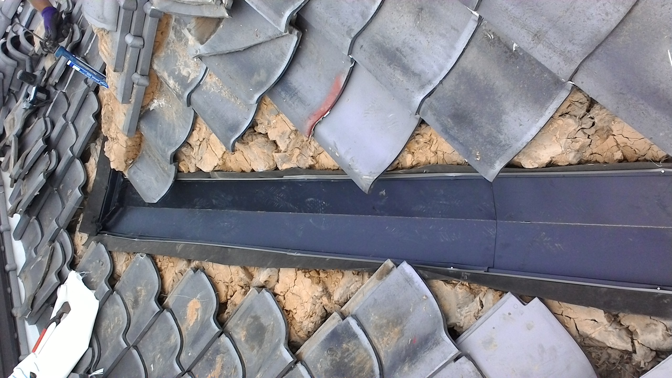 1、谷樋周りの瓦、棟を一度はずし銅製の谷樋をはずします。