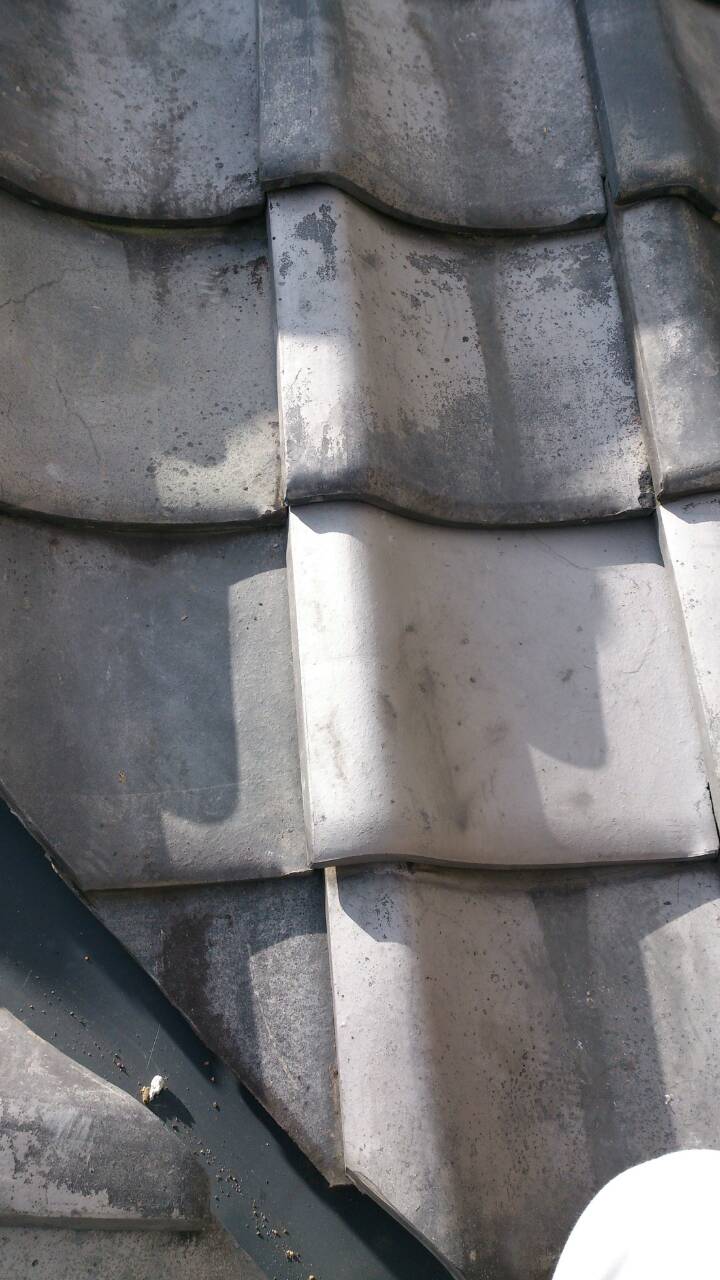 おちている場所や黒くコケがはえている場所が多数ありました。漆喰の落下や樋につまったりする可能性があります。
