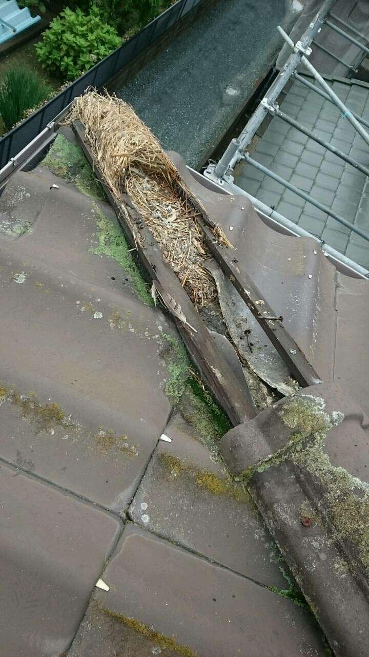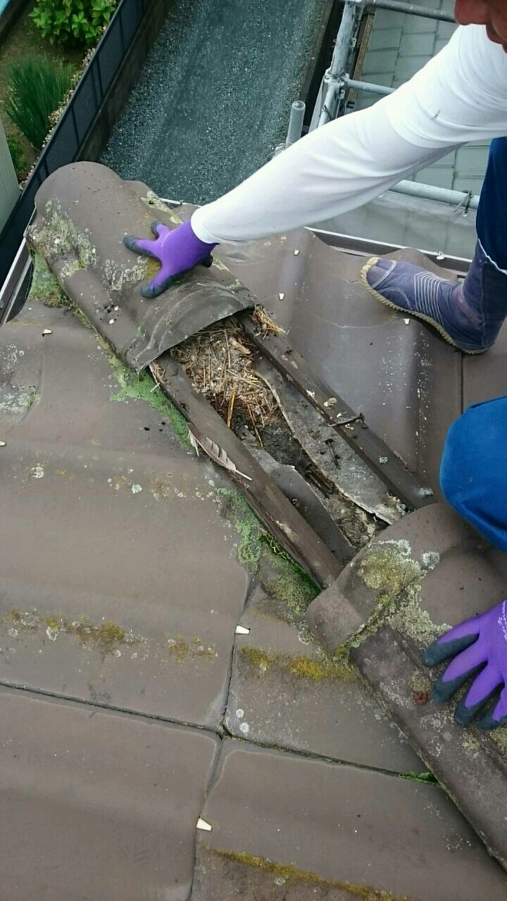 鳥の巣の掃除・隅棟の面戸をふさぐ工事です。