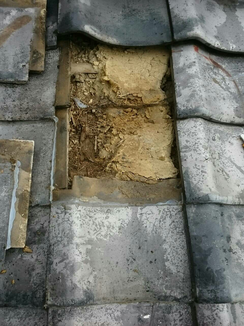 それによりできた穴から入った雨水は瓦の下などから排出されません。