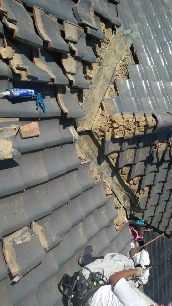 穴の空いた、銅製の谷板金を外せるように谷樋周辺の瓦・棟瓦を外します。